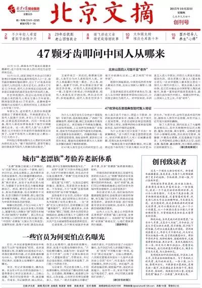 10月22日,在報業(yè)市場不景氣的大環(huán)境下,《北京文摘》逆勢創(chuàng)刊!侗本┪恼肥且环荻际猩铑惖奈恼軋,側(cè)重新聞觀察、時評理論、人文歷史、都市閑情,填補了北京本土文摘報的空白,為讀者閱讀提供了一個新的選擇。《北京文摘》為四開16版,每周四出版,設(shè)置新聞、人文、言論、生活等版組,開設(shè)觀察、人物、聲音、閱讀、常識、閑情等版面。