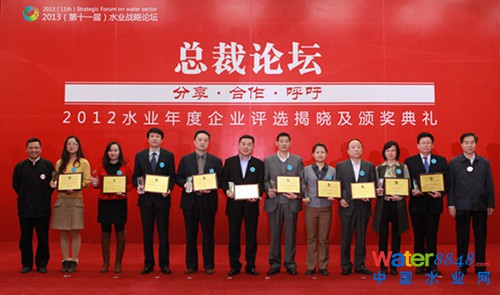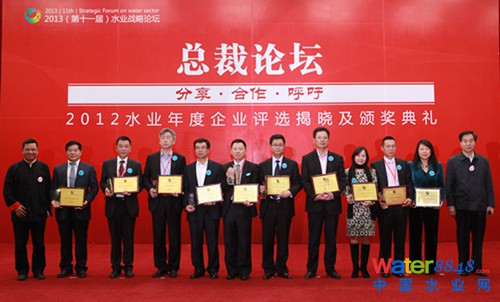 2012年,水業(yè)市場在政策的帶動下,依然保持了較好的發(fā)展態(tài)勢。隨著“十二五”規(guī)劃綱要的漸次出臺,水務(wù)企業(yè)得到了前所未有的發(fā)展良機(jī)。哪些企業(yè)引領(lǐng)著市場發(fā)展方向?哪些企業(yè)正在異軍突起?哪些企業(yè)正在引領(lǐng)模式創(chuàng)新?數(shù)市場風(fēng)云企業(yè),張榜水業(yè)競爭格局,指引水業(yè)熱點風(fēng)向,4月13日下午,在“2013(第十一屆)水業(yè)戰(zhàn)略論壇”上,“2012水業(yè)年度企業(yè)頒獎典禮”隆重舉行。