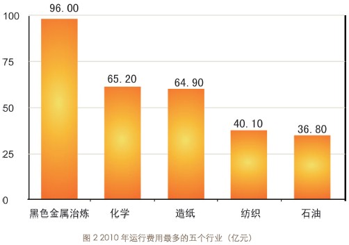 由于不同行業(yè)的工業(yè)廢水所含污染物千差萬(wàn)別,而且有49個(gè)行業(yè)門(mén)類需要遵循環(huán)保部為自己設(shè)定的⼀一套排放標(biāo)準(zhǔn),因此它們采用的處理方法不盡相同,所需投入也有高有低。如圖2所示,黑色金屬冶煉及壓延加工業(yè),化學(xué)原料及化學(xué)制品制造業(yè),造紙及紙制品業(yè),紡織業(yè),石油加工、煉焦及核燃料加工業(yè)的運(yùn)行總費(fèi)用位列前五位,加起來(lái)占全國(guó)此類投入量的56%之多。