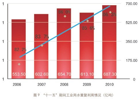 上一組數(shù)據(jù)在⼀一定程度上說(shuō)明了工業(yè)消化掉的再生水量,不過(guò)供給方主要是市政污水處理廠(再生水廠),中間涉及到成本高昂的管網(wǎng)鋪設(shè)和運(yùn)輸問(wèn)題,對(duì)整個(gè)市場(chǎng)的發(fā)展形成掣肘,所以還要結(jié)合工業(yè)企業(yè)的內(nèi)部行為習(xí)慣來(lái)對(duì)前景做出判斷。同在“十一五”時(shí)期,如圖9所示,雖然2008年和2009年的數(shù)據(jù)依然略顯奇怪,但是總體趨勢(shì)十分清晰。期間工業(yè)用水重復(fù)利用量以年均5.6%的速率增長(zhǎng),重復(fù)利用率平均每年增長(zhǎng)超過(guò)1個(gè)百分點(diǎn)。這些水量里面除了經(jīng)處理后回收利用的再生水,還包括循環(huán)用水和一水多用等。