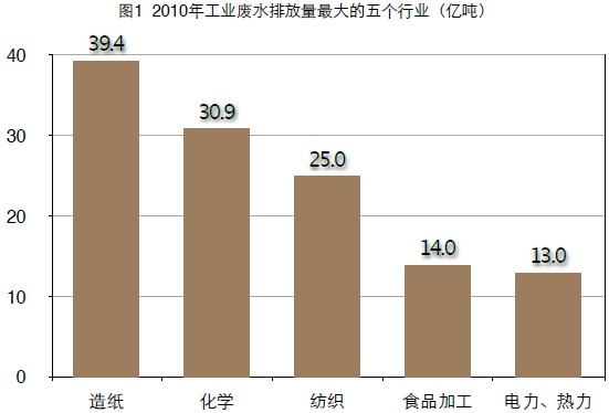 如圖1所示,造紙及紙制品業(yè),化學(xué)原料及化學(xué)制品制造業(yè),紡織業(yè),農(nóng)副食品加工業(yè),電力、熱力的生產(chǎn)和供應(yīng)業(yè)這五大行業(yè)占據(jù)了全國(guó)廢水排放總量的58%。