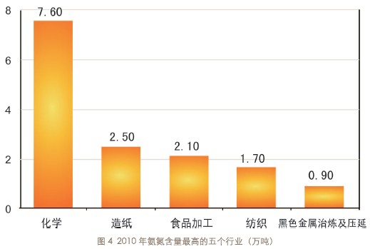 如圖4所示,氨氮含量最高的行業(yè)依次為化學(xué)原料及化學(xué)制品制造業(yè),造紙及紙制品業(yè),農(nóng)副食品加工業(yè),紡織業(yè),黑色金屬冶煉及壓延加工業(yè),共計(jì)占工業(yè)廢水氨氮排放量的60%。