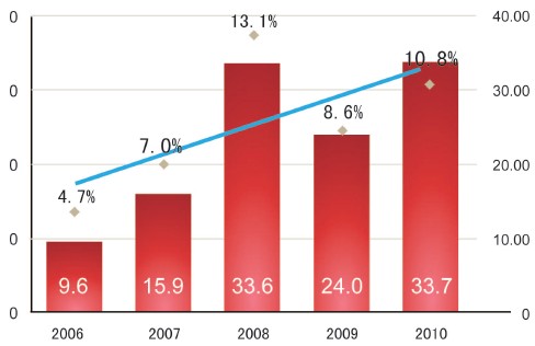 有關(guān)數(shù)據(jù)顯示,2006至2010年間我國(guó)城市污水再生利用量以年均36.9%的速率增長(zhǎng),再生利用率年均增長(zhǎng)2.5個(gè)百分點(diǎn)(2008年受到綠色奧運(yùn)等刺激作用,屬異常因子)。如圖8所示,2010年超過(guò)33.7億噸,相應(yīng)地,當(dāng)年的污水再生利用率超過(guò)10.8%。而據(jù)水利部水資源管理中心主任萬(wàn)育生介紹,工業(yè)在我國(guó)再生水應(yīng)用中占比30%。