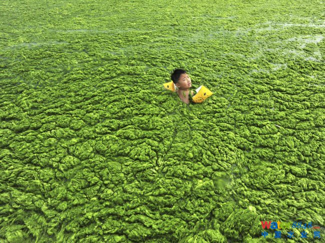 2006年7月18日,中國(guó)東部的安徽省合肥,孩子們?cè)诓紳M綠藻的河水里垂釣。