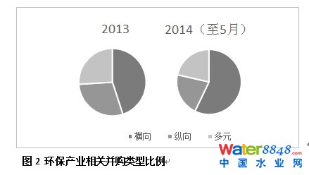 第一,并購類型以橫向擴張為主。從近兩年的并購類型可以看出,環(huán)保產業(yè)的并購還是以行業(yè)內的橫向擴張為主,其比例占一半左右。產業(yè)鏈延伸的縱向并購和跨行業(yè)的多元并購數(shù)量相當。