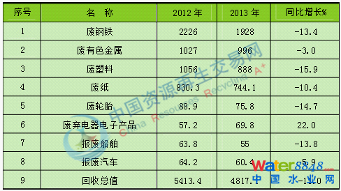 2013年,八大品種再生資源回收總值為4817.1億元,同比下降11%。其中廢塑料降幅最大,同比下降15.9%,廢棄電器電子產(chǎn)品增幅最大,同比增長22%。