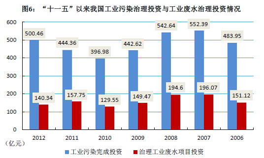 鑒于高污染產(chǎn)業(yè)的發(fā)展所帶來日益增加的環(huán)境負(fù)擔(dān),環(huán)保問題近幾年逐漸得到了國(guó)家的重視,2012年,由發(fā)改委、住建部、環(huán)保部共同編制的《“十二五”全國(guó)城鎮(zhèn)污水處理及再生利用設(shè)施建設(shè)規(guī)劃》問世,其中明確了將投資污水處理設(shè)施近4300億元,而被稱為“水十條”的《清潔水行動(dòng)計(jì)劃》,提出了2萬億元的水污染防治投資計(jì)劃草案,目前也已報(bào)請(qǐng)國(guó)務(wù)院審議,出臺(tái)時(shí)間在望。值得一提的是,環(huán)保部今年明確提出,高濃度難降解工業(yè)廢水處理將作為重點(diǎn)領(lǐng)域發(fā)展,并預(yù)計(jì)投資將達(dá)1250億元。如若達(dá)此目標(biāo),該投資額將相較于“十一五”期間的工業(yè)廢水污染治理投資,增長(zhǎng)約為45%。