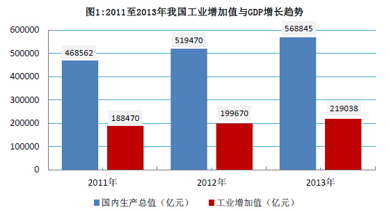 改革開放30多年來,中國(guó)的經(jīng)濟(jì)發(fā)展取得了顯著成績(jī)。根據(jù)國(guó)家統(tǒng)計(jì)局最新數(shù)據(jù)顯示,我國(guó)自實(shí)行“十二五”規(guī)劃以來,國(guó)內(nèi)生產(chǎn)總值以8.9%的增速迅猛增長(zhǎng);2013年,我國(guó)全年國(guó)民生產(chǎn)總值達(dá)到了568845億元,GDP總量已經(jīng)躍居世界第2位,其中,工業(yè)的發(fā)展對(duì)經(jīng)濟(jì)增長(zhǎng)的貢獻(xiàn)率長(zhǎng)期保持在較高水平。據(jù)統(tǒng)計(jì),2011年、2012年和2013年,工業(yè)增加值在GDP中的占比分別達(dá)到了40.2%、38.4%和38.5%,由此看出,“十二五”以來工業(yè)經(jīng)濟(jì)的快速增長(zhǎng)對(duì)拉動(dòng)我國(guó)經(jīng)濟(jì)增長(zhǎng)起到了不可忽視的推動(dòng)作用。(見圖1)