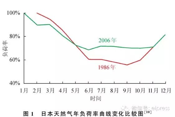 日本消費(fèi)的天然氣幾乎全來(lái)自進(jìn)口的LNG。2006年底日本有27個(gè)LNG接收站,總能力7044萬(wàn)t/a。2008年日本消費(fèi)天然氣約987億m3,進(jìn)口LNG占93%。下游用戶約60%將天然氣用于用量穩(wěn)定的發(fā)電和工業(yè)燃料。20世紀(jì)80年代前日本主要用電制冷、天然氣和重油供暖。2000年起天然冷熱電聯(lián)供CCHP在日本迅速普及推廣,新建公共建筑物有一半采用天然氣CCHP。從圖1兩條曲線的變化可以看出,僅用6年時(shí)間建設(shè)的天然氣CCHP系統(tǒng)不僅減少了冬夏耗氣量差,而且平衡了用電負(fù)荷,提高了供冷、暖的能效。
