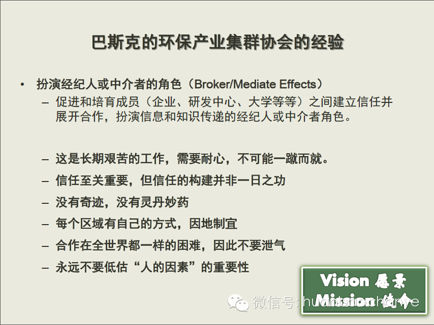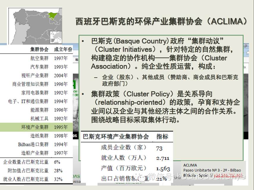 舉一個(gè)國(guó)際上的環(huán)保產(chǎn)業(yè)集群協(xié)會(huì)的例子,西班牙的巴斯克環(huán)保產(chǎn)業(yè)集群協(xié)會(huì)。它在集群動(dòng)議這方面,在國(guó)際上都是榜樣。環(huán)保產(chǎn)業(yè)集群是當(dāng)?shù)氐?2個(gè)集群之一,它的集群政策是關(guān)系導(dǎo)向的政策,孕育和支持各類合作關(guān)系。根據(jù)它的經(jīng)驗(yàn),集群協(xié)會(huì)將是一項(xiàng)長(zhǎng)期且艱苦的工作。