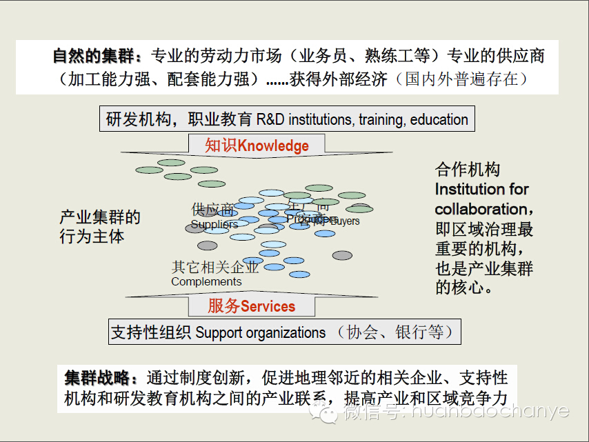 集群戰(zhàn)略則是通過制度創(chuàng)新來促進(jìn)地理相鄰的相關(guān)企業(yè)、支持性機(jī)構(gòu)和研發(fā)教育機(jī)構(gòu)之間的產(chǎn)業(yè)聯(lián)系,提高產(chǎn)業(yè)和區(qū)域競(jìng)爭(zhēng)力。這里最主要的就是制度創(chuàng)新和產(chǎn)業(yè)聯(lián)系。2011年聯(lián)合國(guó)貿(mào)發(fā)會(huì)議上的一個(gè)報(bào)告曾提出:建立產(chǎn)業(yè)聯(lián)系是最重要的任務(wù),包括吸引外資,F(xiàn)在很多的地方和政府也明確要打造產(chǎn)業(yè)鏈,建立產(chǎn)業(yè)聯(lián)系,但是卻錯(cuò)誤的認(rèn)為這種聯(lián)系只是一種技術(shù)構(gòu)造,好像就是缺什么環(huán)節(jié)補(bǔ)什么環(huán)節(jié)。但是實(shí)際上產(chǎn)業(yè)聯(lián)系不僅是技術(shù)的聯(lián)系,更重要的是社會(huì)聯(lián)系。合作機(jī)構(gòu)、促進(jìn)合作的機(jī)構(gòu),才是產(chǎn)業(yè)集群的核心。
