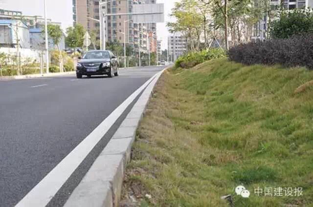 “在自行車道和人行道鋪設(shè)了透水瀝青和透水磚,下面不是水泥砂漿的不透水層,而是采用厚度15~20厘米的砂層和卵石墊層。它們孔隙率很高,能鎖住大量雨水,在雨后緩慢滲透至土壤。”任心欣說,“中間綠化帶的設(shè)計(jì)也有講究。綠化帶兩側(cè)設(shè)有下凹綠地(植生滯留槽),比路面低15厘米左右。這樣,車行道的雨水可通過路牙的孔洞匯集進(jìn)來,然后儲(chǔ)存在土壤層中并得以滯留和凈化。”