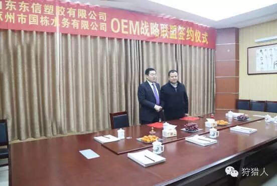 核心提示:【公司步伐】公司與涿州國棟水務集團“OEM戰(zhàn)略合作”揭牌及簽約儀式隆重舉行 東信塑膠公司總經理王全龍與國棟水務集團劉總在商務中心舉行簽約儀式