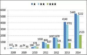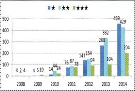 近年來(lái),我國(guó)綠色建筑的數(shù)量增長(zhǎng)很快,尤其是中高等級(jí)的三星級(jí)和二星級(jí)綠色建筑項(xiàng)目的增長(zhǎng)幅度超過(guò)上年度1倍,2014年新建綠色建筑面積已經(jīng)達(dá)到1億多平方米,如果將大量按綠建標(biāo)準(zhǔn)設(shè)計(jì),但未評(píng)星級(jí)的保障房項(xiàng)目列入的話,去年建成或設(shè)計(jì)的綠色建筑數(shù)量和面積則比上一年度多出一倍還多(圖1、圖2)。