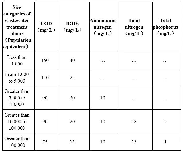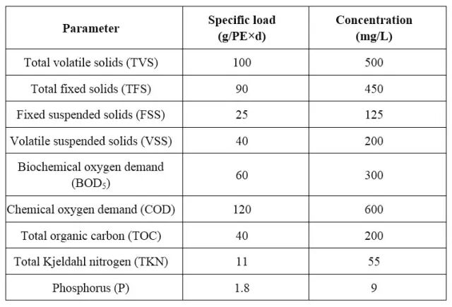 如之前所述,20世紀末期,生物處理工藝在各個污水處理廠得以廣泛應用,甚至包括小型污水處理廠以及分散型污水處理廠。對人口當量小于5000的小型污水處理廠而言,BOD5和COD是唯一的去除對象;對于人口當量為5000~10000的污水處理廠而言,除了BOD5、COD以外,氨氮也是需要去除的對象;對于人口當量大于10000的大型污水處理廠而言,除上述去除對象外,還需要去除氮、磷等營養(yǎng)物。表1展示了原污水中的各項指標平均負荷和濃度;表2展示了污水處理后的最低排放要求。