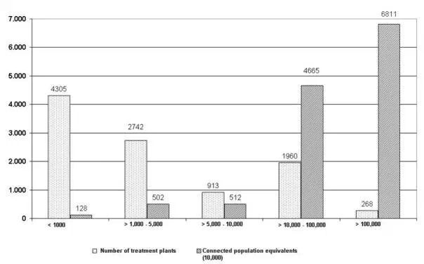 為了滿足以上排放標準,德國目前大約有10000座污水處理廠在運行當中。這些污水廠大約需要處理8千萬人口當量的生活污水以及5千萬人口當量的工商業(yè)污水,這些工商業(yè)污水也會排入當?shù)毓才潘到y(tǒng)。具體情況見圖5和圖6。