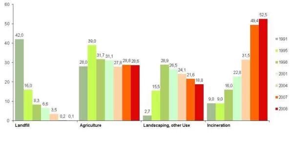 德國的市政污水處理廠每年大約要產(chǎn)生2百萬噸污泥(干泥量),其中50%以上的污泥將被焚燒,這其中有20%是獨立焚燒的,剩余30%會在發(fā)電廠和固體廢物焚燒爐里與其他物質一起協(xié)同焚燒。除去需要焚燒的污泥以外,剩余不到50%的污泥將被農(nóng)田以及景觀工程利用。自2006年起,因為污泥中有機物含量較高,政府不再允許將其填埋在垃圾場,同時,污泥在農(nóng)田利用方面的使用率也有所下降,因為污泥中含有重金屬、有機化合物以及病原菌等污染物(圖8)。