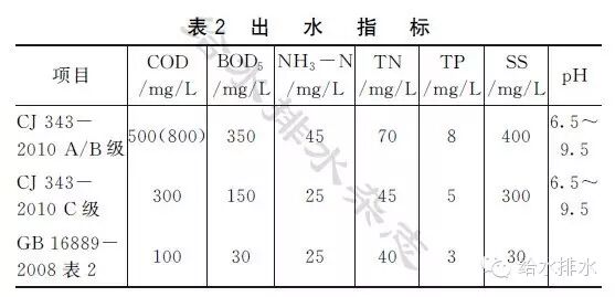 基于滲濾液的水質(zhì)特點(diǎn),需對(duì)滲濾液進(jìn)行處理后排放,避免滲濾液無(wú)序排放對(duì)周圍環(huán)境造成的破壞。由于中心城區(qū)垃圾轉(zhuǎn)運(yùn)站周邊一般配套建有市政管網(wǎng),站內(nèi)滲濾液就地處理后出水達(dá)到《污水排入城鎮(zhèn)下水道水質(zhì)標(biāo)準(zhǔn)》(CJ 343-2010)即可。與《生活垃圾填埋場(chǎng)污染控制標(biāo)準(zhǔn)》(GB 16889-2008)相比,轉(zhuǎn)運(yùn)站滲濾液出水執(zhí)行的標(biāo)準(zhǔn)相對(duì)寬松,見2