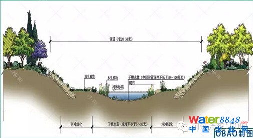 形成較為連續(xù)和穩(wěn)定的水系空間是川北河生態(tài)系統(tǒng)恢復(fù)的重要基礎(chǔ),因此對貧乏的水資源要高效利用。具體來說是在滿足生態(tài)功能需要的前提下,將水體空間塑造成狹長的子槽水系,減少水系面積,以減少河水的蒸發(fā)量與滲漏量,節(jié)約水資源。設(shè)計方法是在河床中間位置疏挖子槽,形成具有一定深度和寬度的過水?dāng)嗝妗?/p>