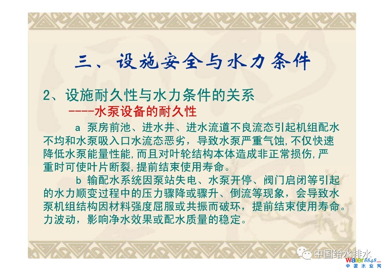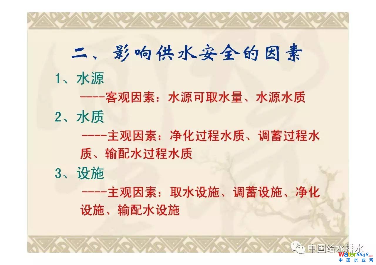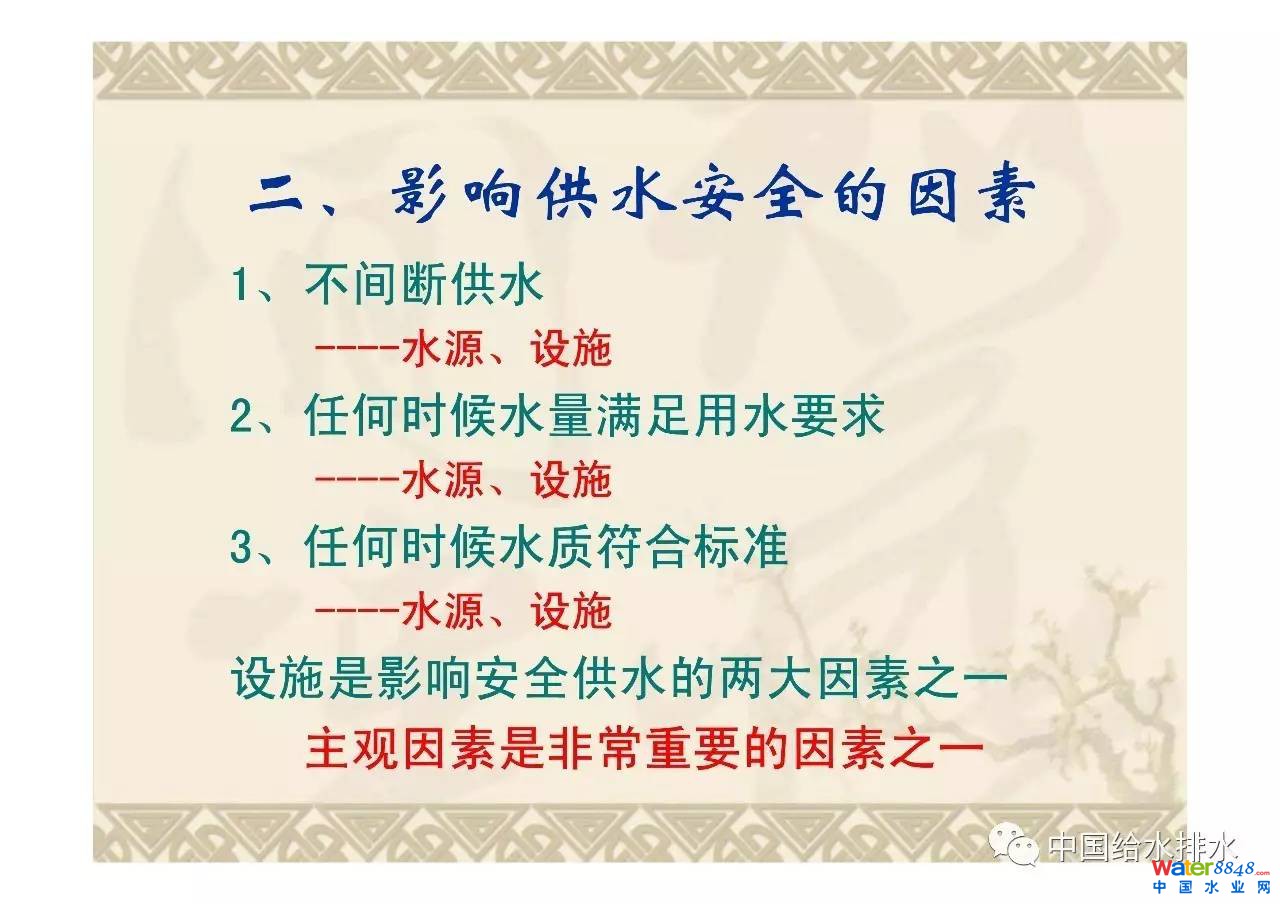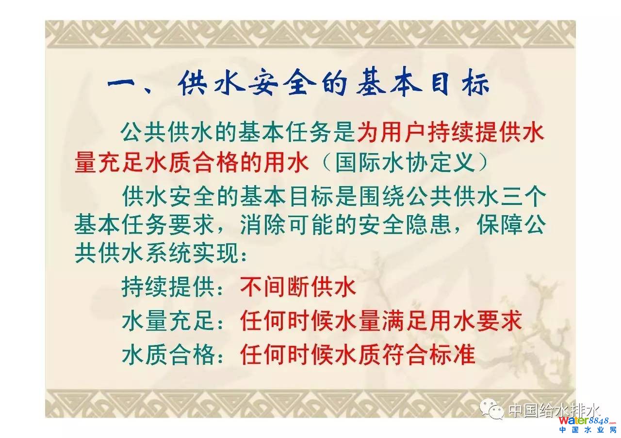 公共供水的基本任務是為用戶持續(xù)提供水量充足、水質合格的用水,供水安全的基本目標是圍繞公共供水三個基本任務要求,消除可能的安全隱患,保障公共供水系統(tǒng)實現持續(xù)提供、水量充足、水質合格。分析了影響供水安全的因素即水源、水質和設施,指出了設施穩(wěn)定運行與水力條件的關系,給出了水力優(yōu)化重點和對策。