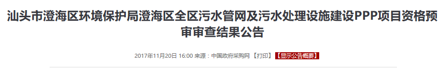 今日(11月20日)下午, 從中國政府采購網(wǎng)獲悉,預(yù)算采購金額逾68億元的“汕頭市澄海區(qū)環(huán)境保護局澄海區(qū)全區(qū)污水管網(wǎng)及污水處理設(shè)施建設(shè)PPP項目”資格預(yù)審結(jié)果發(fā)布,包括國禎環(huán)保、碧水源等7家聯(lián)合體通過資格預(yù)審。