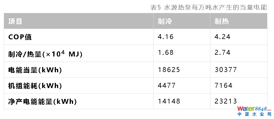 通過計算可知(表5),水源熱泵系統(tǒng)每利用1萬噸二級出水的制冷量和制熱量分別為1.68×105 MJ和2.74 MJ,考慮水源熱泵機(jī)組自身能耗(通過COP定義得出),則二級出水在夏季和冬季凈產(chǎn)能當(dāng)量分別為14148 kWh/萬m3和23213 kWh/萬m3。由此可知,污水中的熱能是污水廠最大的能量“家底”。據(jù)此匡算,案例污水廠每天僅利用8萬噸二級出水(即13.3%的出水量)作為污水源熱泵的冷、熱源,就可滿足污水廠運(yùn)行能耗的51%(制冷)和83.6%(制熱)。加上上述提及的污泥厭氧消化和太陽能回收,案例污水廠已可實(shí)現(xiàn)“能量平衡”。