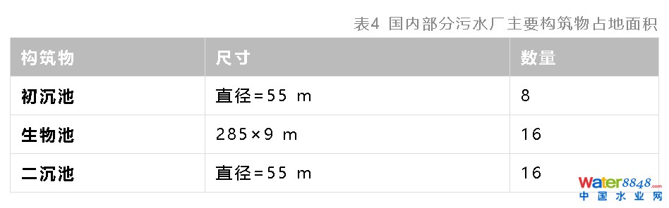 按照E20-327型光伏板性能、案例污水廠所在地的光照條件,單塊光伏板每天產(chǎn)生的能量約為1.09 kWh(單板占地面積為4.65 m2)。如果在案例污水廠主要構(gòu)筑物平面(表4)上安裝E20-327型光伏板,可計算得其可回收的太陽能總量為82725 MJ/d,僅僅能滿足案例污水廠運(yùn)行能耗的10.4%,即通過光伏發(fā)電可獲取的能量顯得有些“微不足道”!