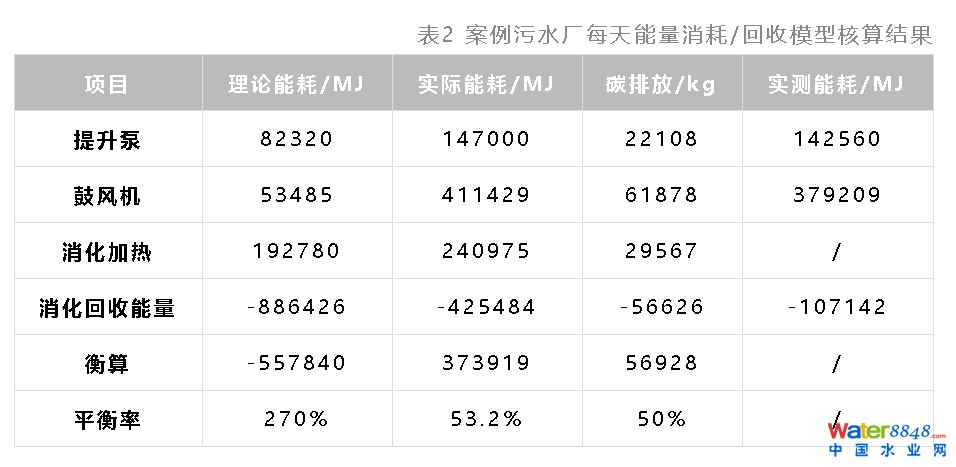 從最終的能量匡算結(jié)果來看,此案例污水廠從剩余污泥回收的能量可以提供能耗總量的53.2%,也就是說案例污水廠如果僅僅依賴污水中的有機(jī)物通過厭氧消化回收能量,距“能量平衡”目標(biāo)尚且有一半的差距。