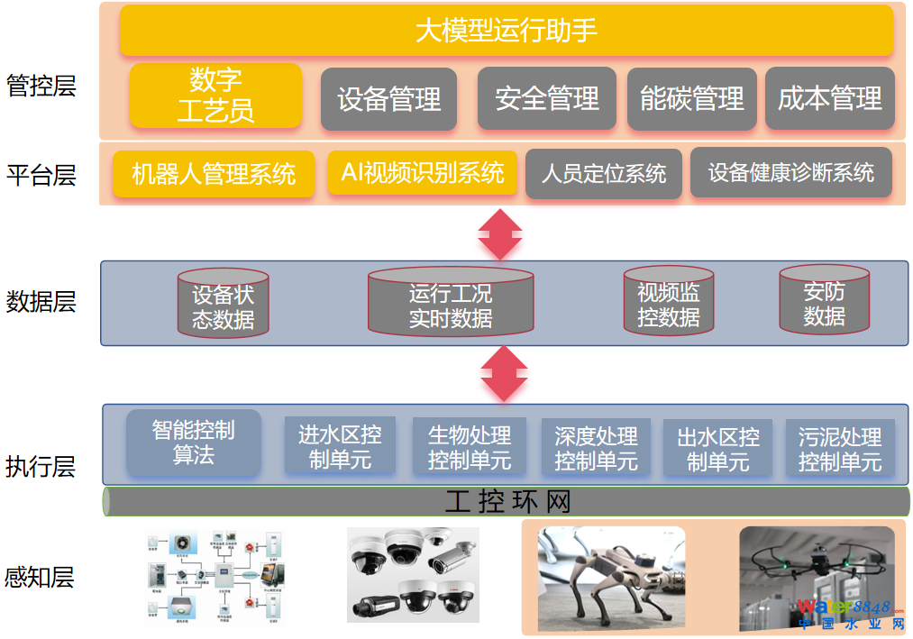 基于具身智能的智能感知體系。在生產(chǎn)現(xiàn)場(chǎng)增加無人機(jī)、機(jī)器狗、具身機(jī)器人、無人船替代人進(jìn)行現(xiàn)場(chǎng)巡檢,通過具身智能的應(yīng)用,以圖像、聲音等多維度的感知模式實(shí)時(shí)獲取儀表讀數(shù)、人的行為、工藝運(yùn)行狀態(tài)以及設(shè)備狀態(tài)。同時(shí),建立視頻AI識(shí)別平臺(tái),將上述視頻統(tǒng)一接入到該平臺(tái)中,通過基于深度學(xué)習(xí)算法的視頻識(shí)別模型自動(dòng)識(shí)別抽煙、摔倒等動(dòng)態(tài)安全風(fēng)險(xiǎn)以及生物池曝氣狀態(tài),二沉池跑泥情況等工藝運(yùn)行狀態(tài),實(shí)現(xiàn)替代人自動(dòng)感知現(xiàn)場(chǎng)生產(chǎn)情況,大幅提高感知的時(shí)效性和連續(xù)性。