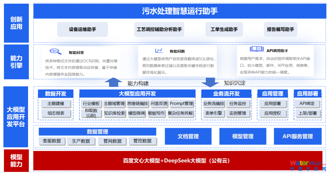 基于通用大模型的智慧運(yùn)行助手。采用通用大模型(LLM模型)建立智慧運(yùn)行助手,形成一個(gè)虛擬的“全能型”污水處理技術(shù)人員,可為工藝人員提供工藝調(diào)控優(yōu)化建議,為設(shè)備管理人員和安全管理人員提供精準(zhǔn)的專業(yè)知識(shí)。